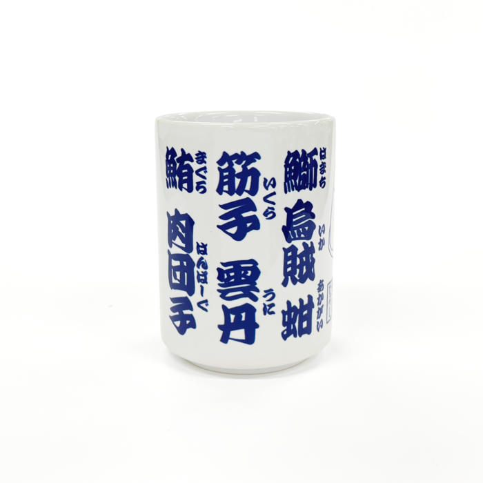 ひろし考案の「寿司打線」がずらりと並んだ 寿司屋気分が味わえる本格ゆのみ。昼メシのプロ気分でお茶を楽しめます。