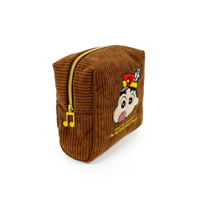 しんちゃんのサガラ刺繍がふっくらキュート! 季節感のあるコーデュロイ素材のポーチです。小物やコスメを可愛く収納して、毎日をハッピーに彩ろう!