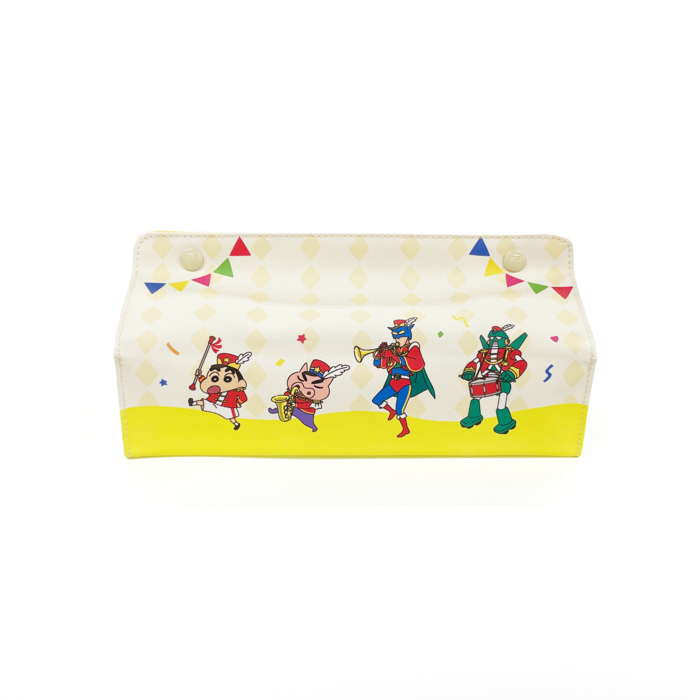マーチングバンドのしんちゃんたちがデザインされた、ポップでカラフルなティッシュカバー。生活感の出るアイテムも、これで一気に明るくハッピーにチェンジ!