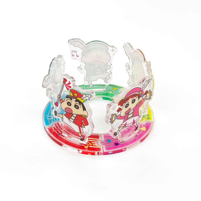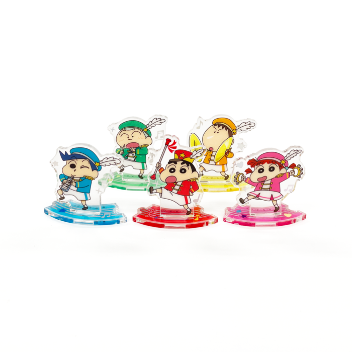 マーチングバンドのしんちゃんたちがアクリルスタンドに! 角度でキラキラ光るオーロラ加工に注目。全5種は集めてつなげられる台座仕様!可愛く並べてマーチングパレードを楽しもう♪